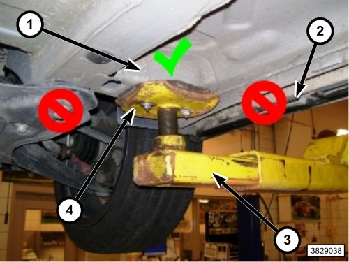 CAUTION: Do not allow the hoist lift arm (3) to contact the body sill or cladding (2) or damage to the vehicle may result.