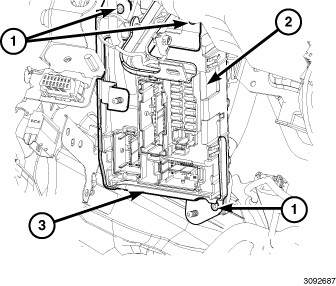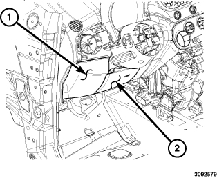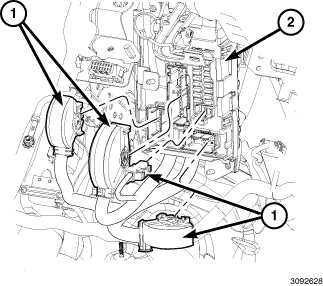 1. Position the Body Control Module (BCM) (2) into the vehicle and connect the two electrical connectors on the back of the module.