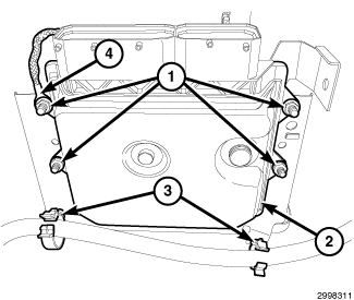 10. Remove the four nuts (1) with ground strap (4) and remove the PCM (2) from the battery tray.