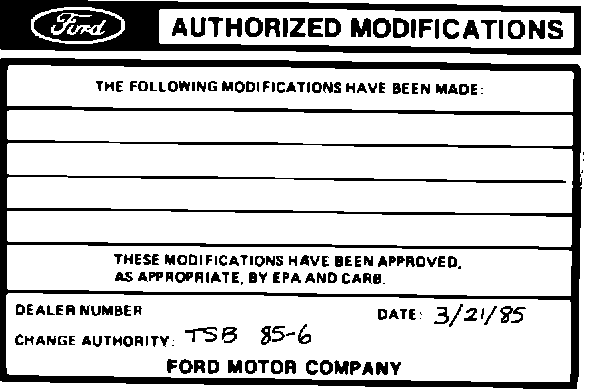 Obtain an Authorized Modifications decal and list the date, dealer number and summary of alterations performed. Select a prominent place adjacent to the Vehicle Emission Control Information decal suitable for installing the Authorized Modifications decal. Clean the area, install the decal and cover it with a clear plastic decal shield.
