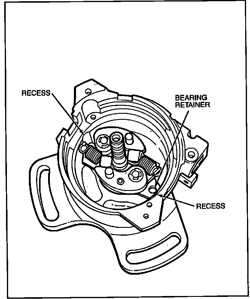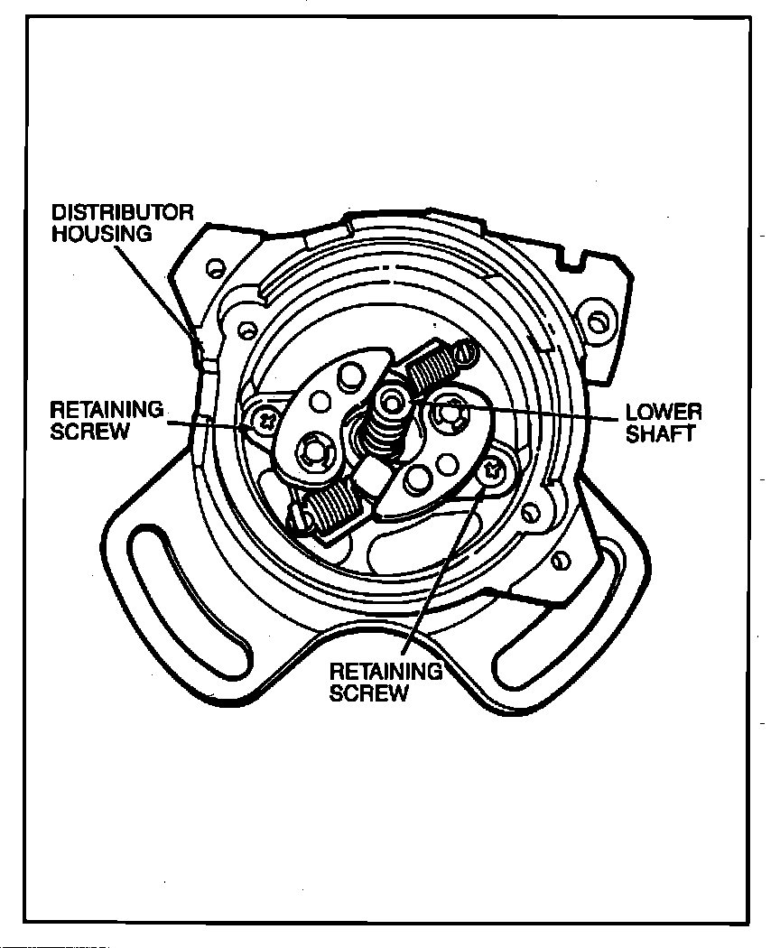 9. Remove lower shaft retaining screws, then the lower shaft and seal from the distributor housing. Then remove two E-clips, springs, weights, bearing and retainer from the lower shaft.