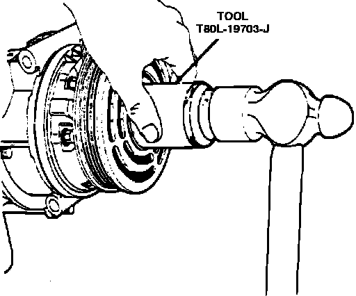 2. Install pulley and bearing on compressor. Bearing should be a slip fit onto compressor head. If difficulty is encountered installing pulley, gently tap pulley on compressor using tool T80L-19703-J or equivalent, Fig. 4. Ensure pulley bearing is aligned with compressor head.