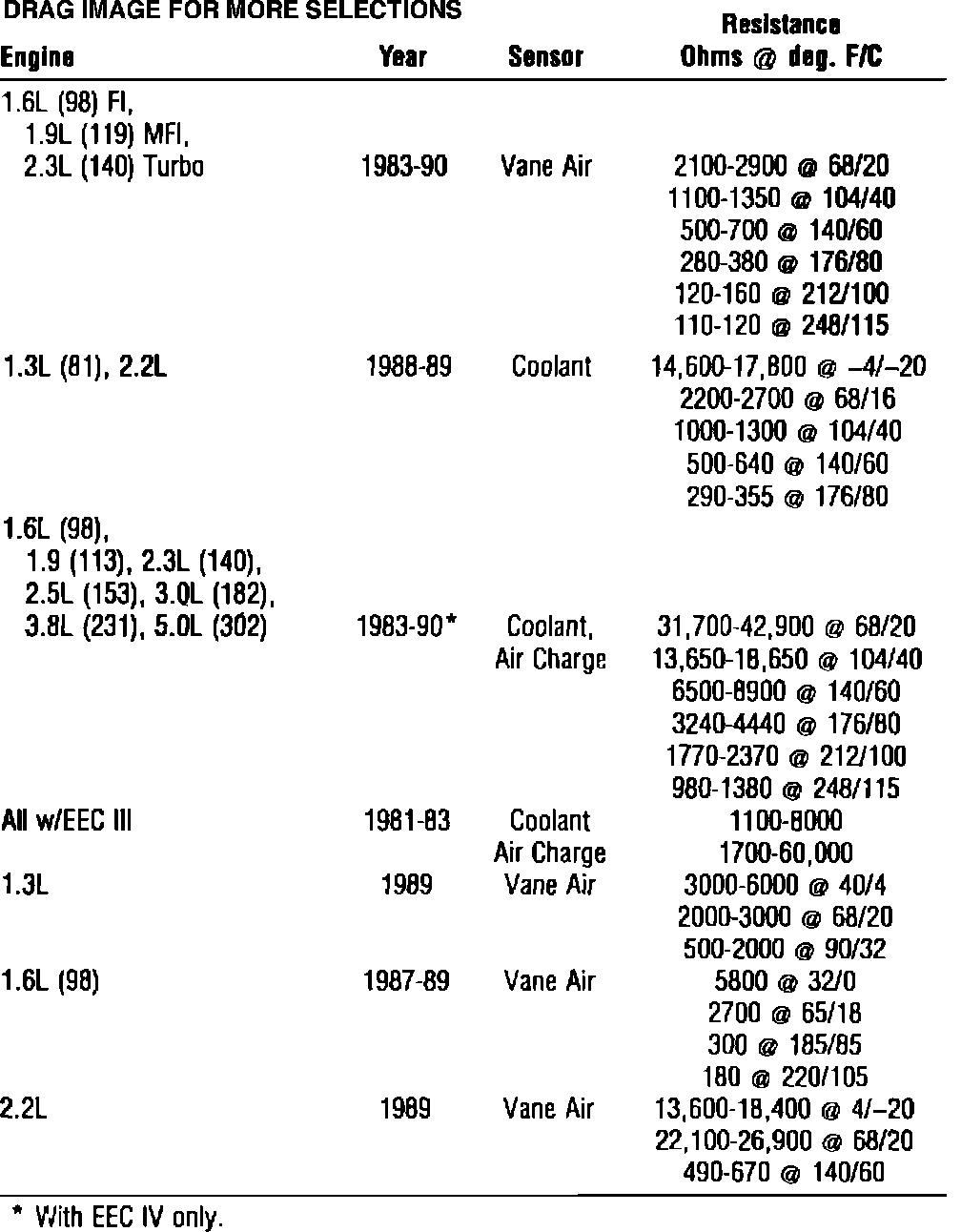Home >> Ford >> 1990 >> Taurus V6-232 3.8L >> Repair and Diagnosis >> Specifications >> Electrical Specifications >> Coolant Temperature Sensor/Switch (For Computer)