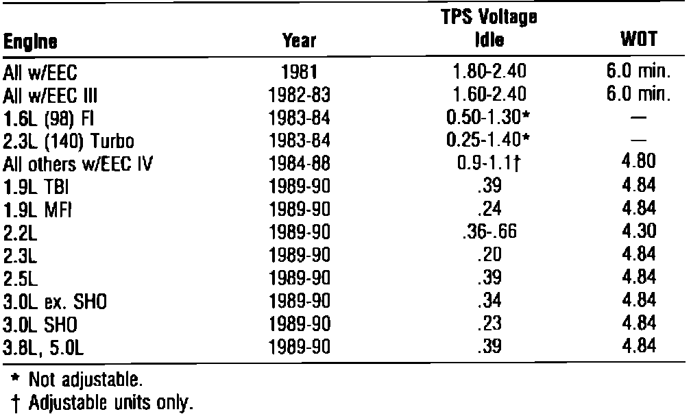 Home >> Ford >> 1990 >> Taurus V6-232 3.8L >> Repair and Diagnosis >> Specifications >> Electrical Specifications >> Throttle Position Sensor