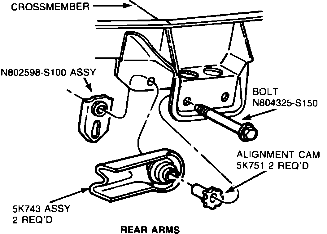 Toe-in and toe-out can be adjusted if it is determined that the vehicle is not within alignment specifications. To adjust toe of either wheel, loosen bolt attaching rear control arm to body, Fig. 2, and rotate alignment cam until the required alignment setting is obtained. Torque control arm attaching bolt to 52-74 ft. lbs.