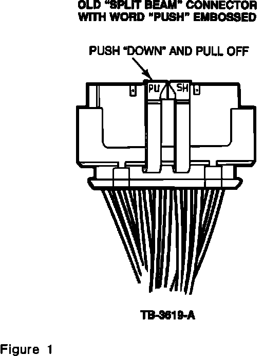 ^ The previous style connector had a split beam that had to be pushed "down" while the connector was being pulled off. The word "PUSH" is embossed on the end of the split beam, Figure 1.
