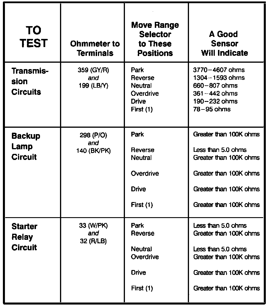 Transmission Range Sensor - Component Testing Procedure:
