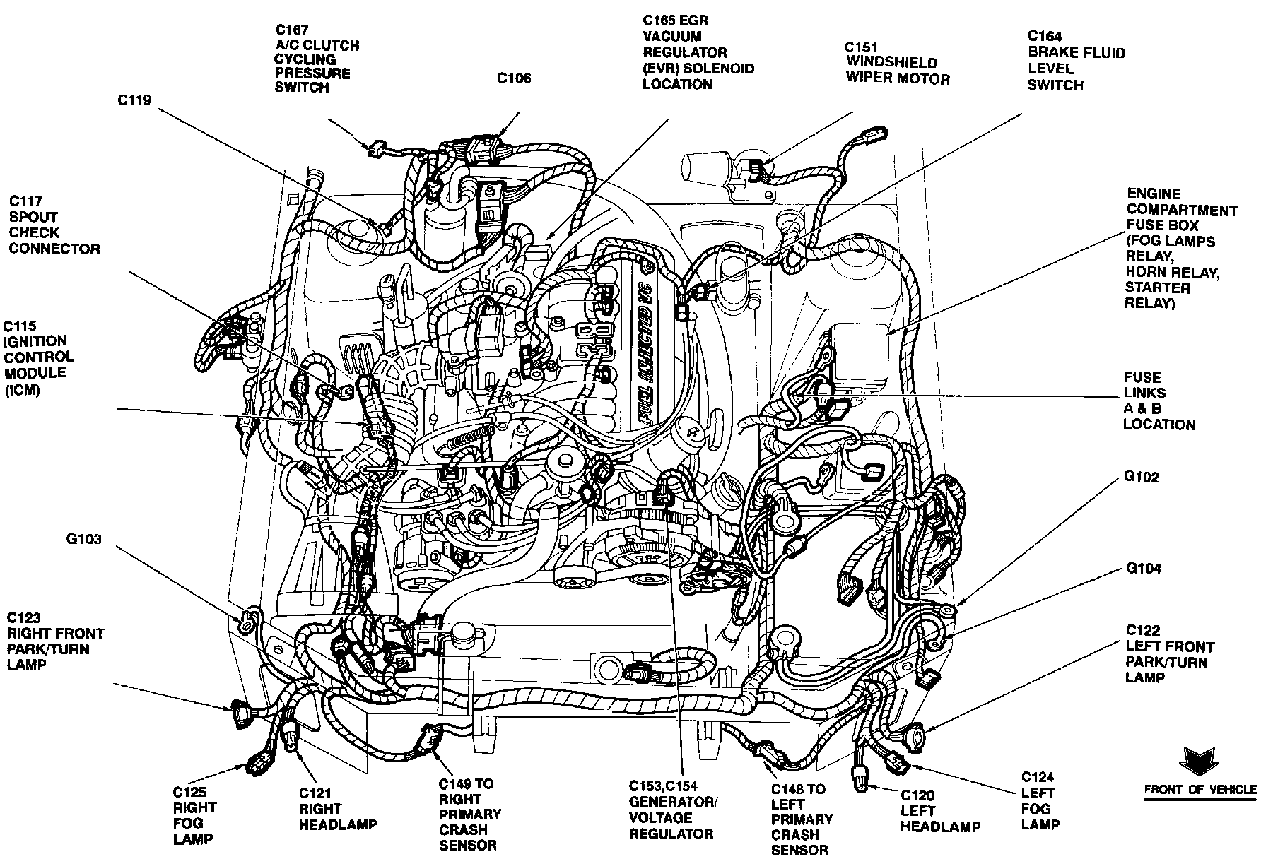 The Ignition Control Module is located on the RH fender apron, forward of strut tower.