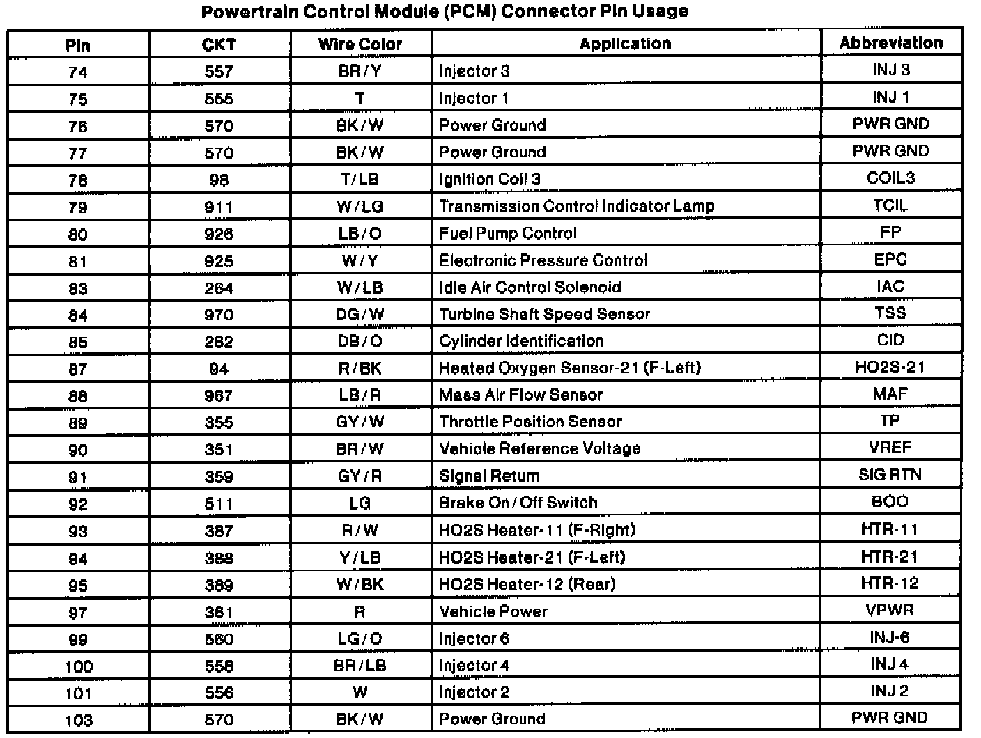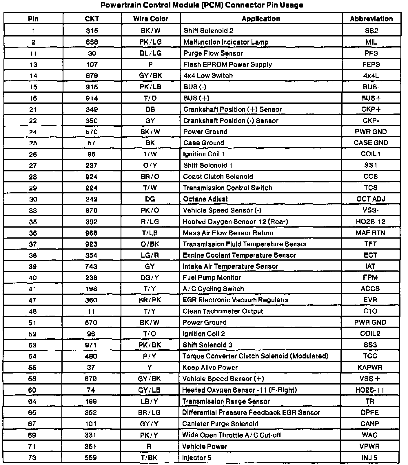 Powertrain Control Module (PCM) Connector Pin Usage (Part 2 Of 2):