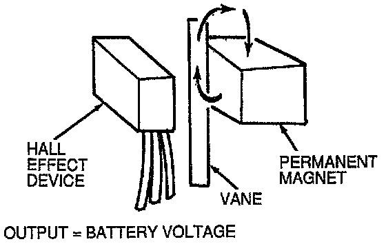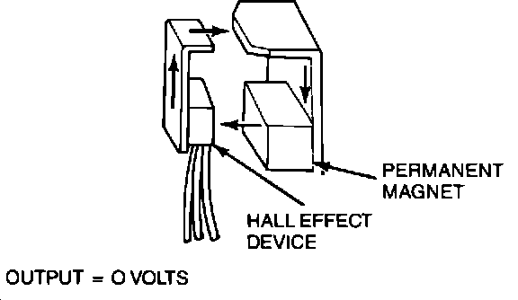 4. When the window of the vane cup is between the magnet and the Hall effect device, a magnetic flux field is completed from the magnet through the Hall effect device and back to the magnet.