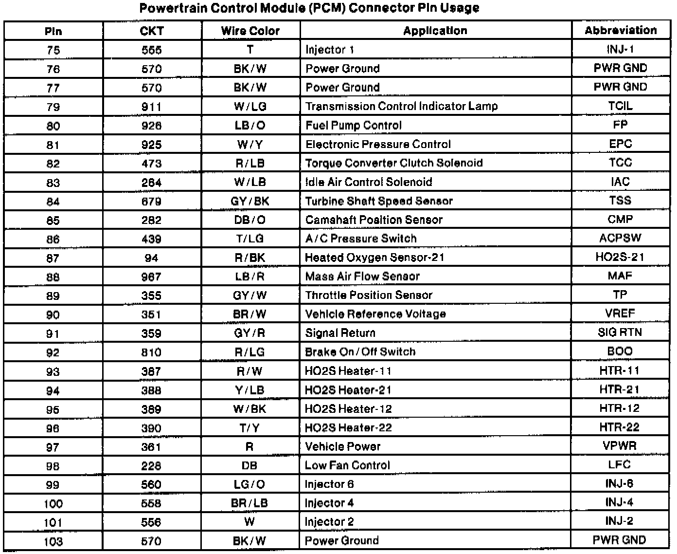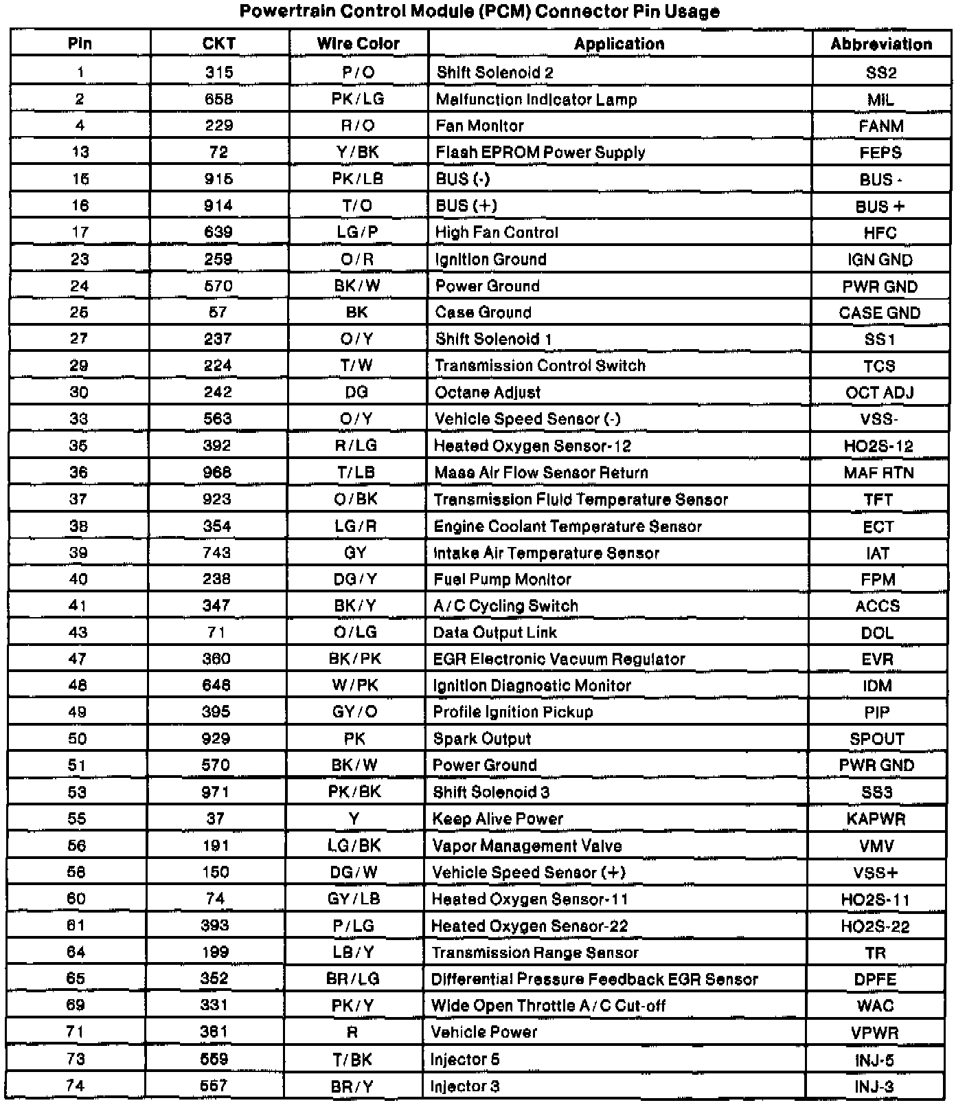 Powertrain Control Module (PCM) Connector Pin Usage (Part 2 Of 2):