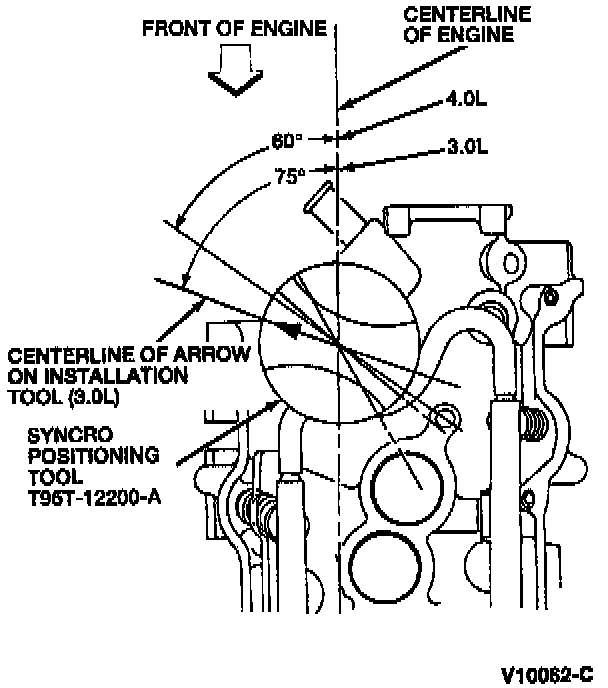 5. Install camshaft synchronizer so that drive gear engagement occurs when arrow on Syncro Positioning Tool T95T-12200-A is pointed approximately 60 degrees COUNTERCLOCKWISE OFF the CENTERLINE of the engine. This step will locate Camshaft Position Sensor (CMP) electrical connector to the original position.