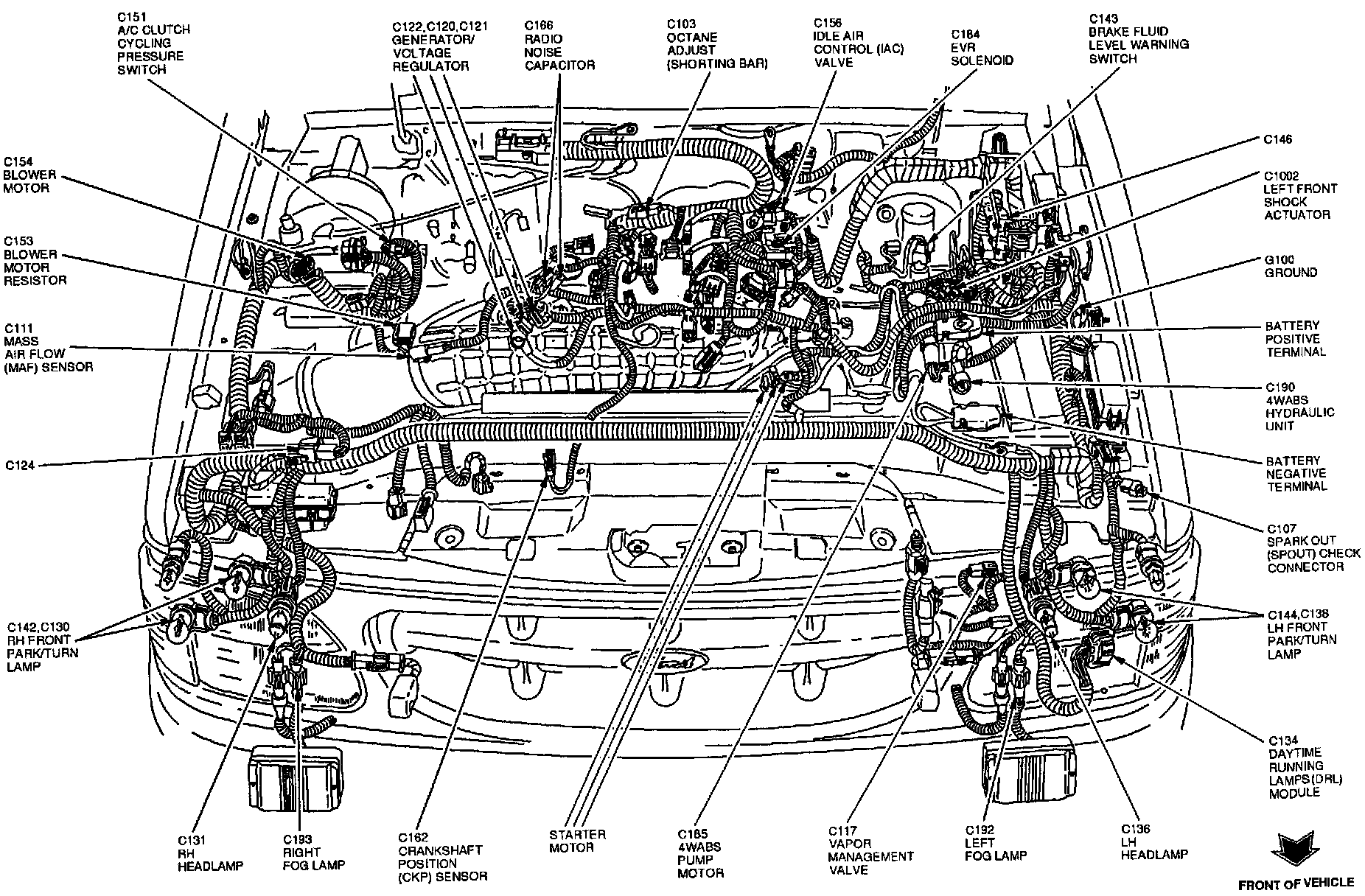 The SPOUT check connector (C107) is located at the LF corner of engine compartment.