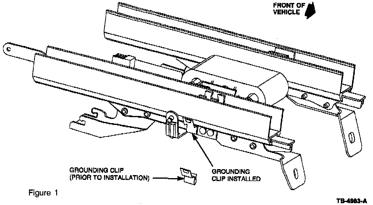 2. Position the carbon steel grounding clip on the seat track section on the console side of the seat. Refer to Figure 1.