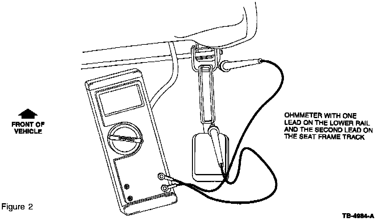 6. Use an ohmmeter to verify that connection is made between the upper and lower seat track rails. Move the seat track to the full front travel position, then move it back 25-76 mm (1-3"). Place one lead of the ohmmeter on the lower seat rail between the two (2) plastic slides, and the second lead on the seat frame track (Figure 2). Any resistance measurement other than an open ensures proper connection/installation.