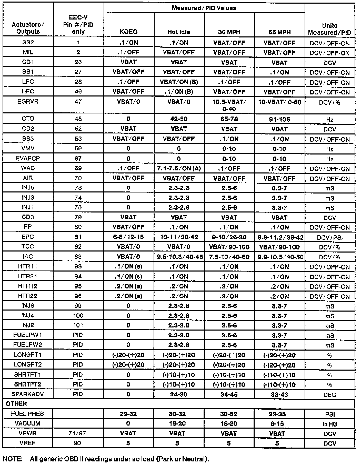 NOTE: All generic OBDII readings under no load (PARK or NEUTRAL).