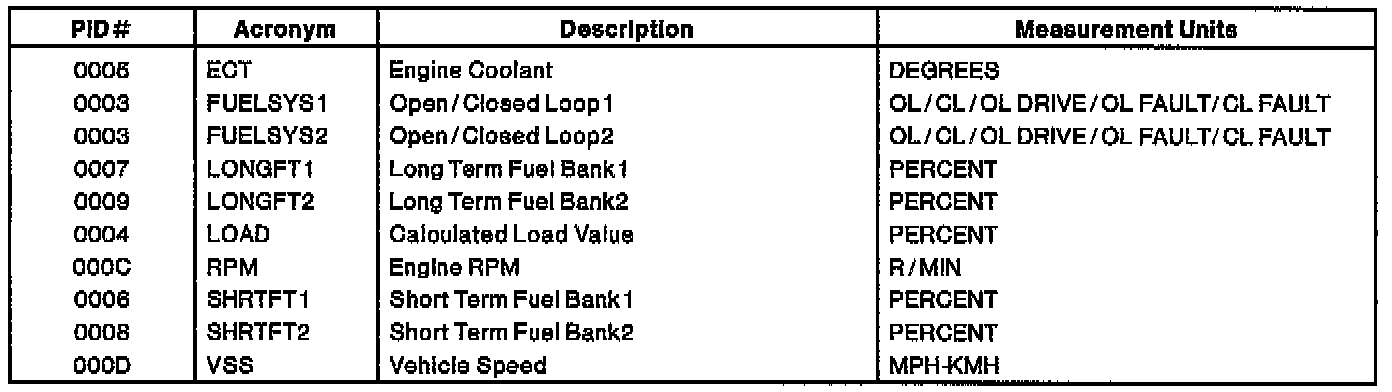 Freeze Frame Data allows access to emission related values from specific generic PIDs. These values are stored the instant an emission related DTC is stored in Continuous Memory. This provides a snapshot of the conditions that were present when the DTC was stored. Once one set of freeze frame data is stored, this data will remain in memory even if another emission related DTC is stored, with the exception of Misfire or Fuel System DTCs. Once freeze frame data for Misfire or Fuel System DTC is stored, it will overwrite any previous data and freeze frame will not be further overwritten. When a DTC associated with the freeze frame is erased or a PCM memory reset is performed, new freeze frame data can be stored again. In the event of multiple emission related DTCs in memory, always note the DTC for the freeze frame data.
