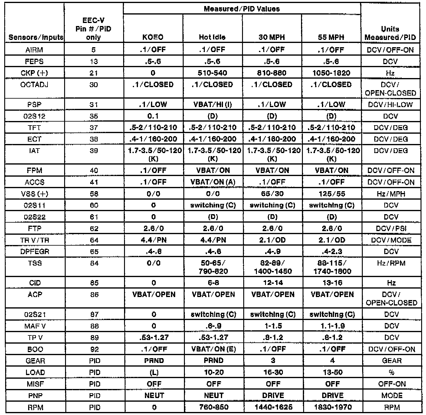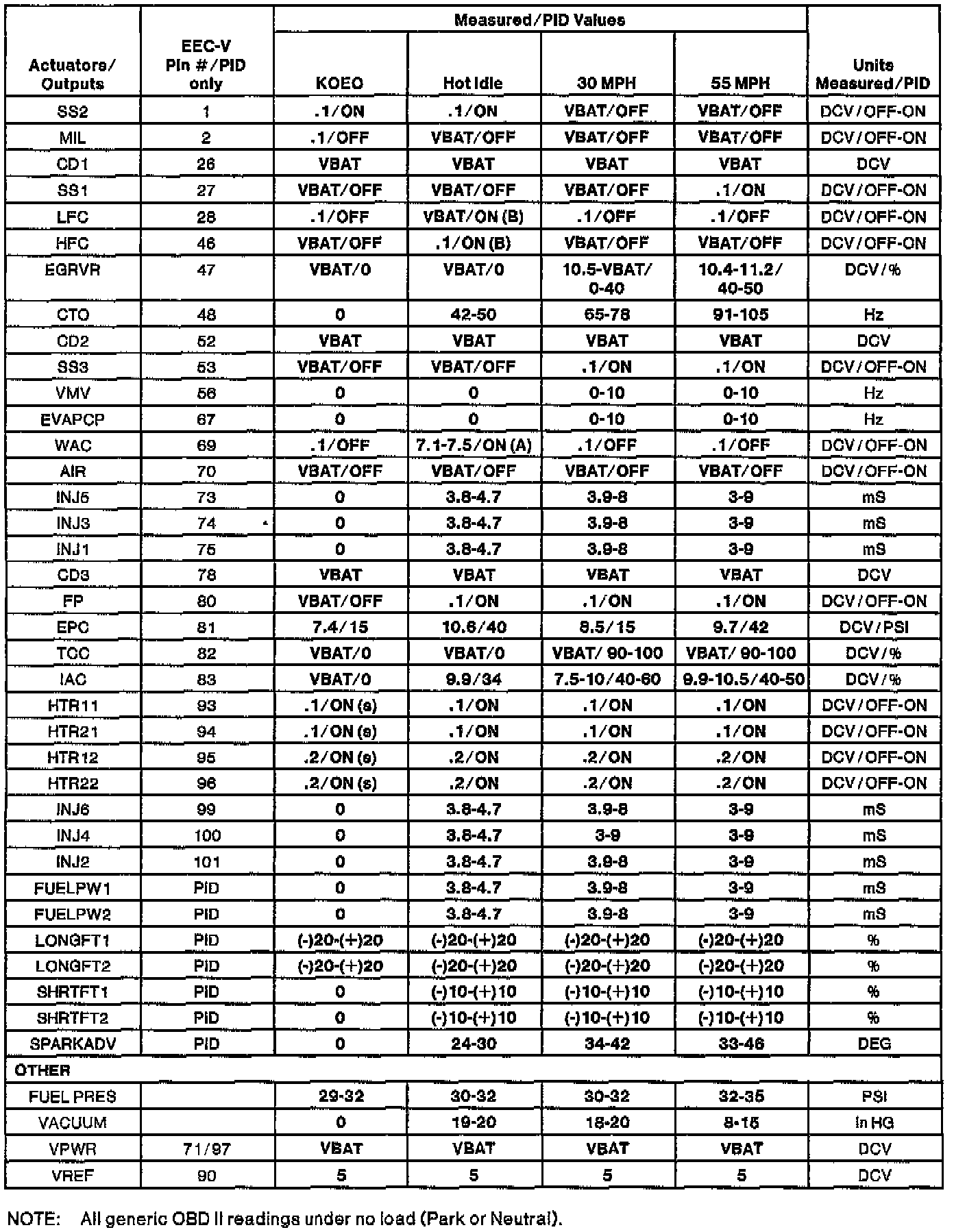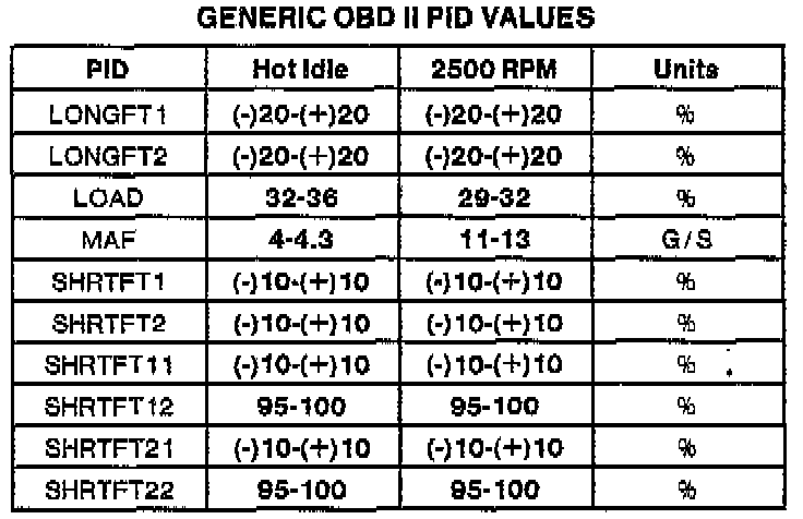 NOTE: All generic OBDII readings under no load (PARK or NEUTRAL).