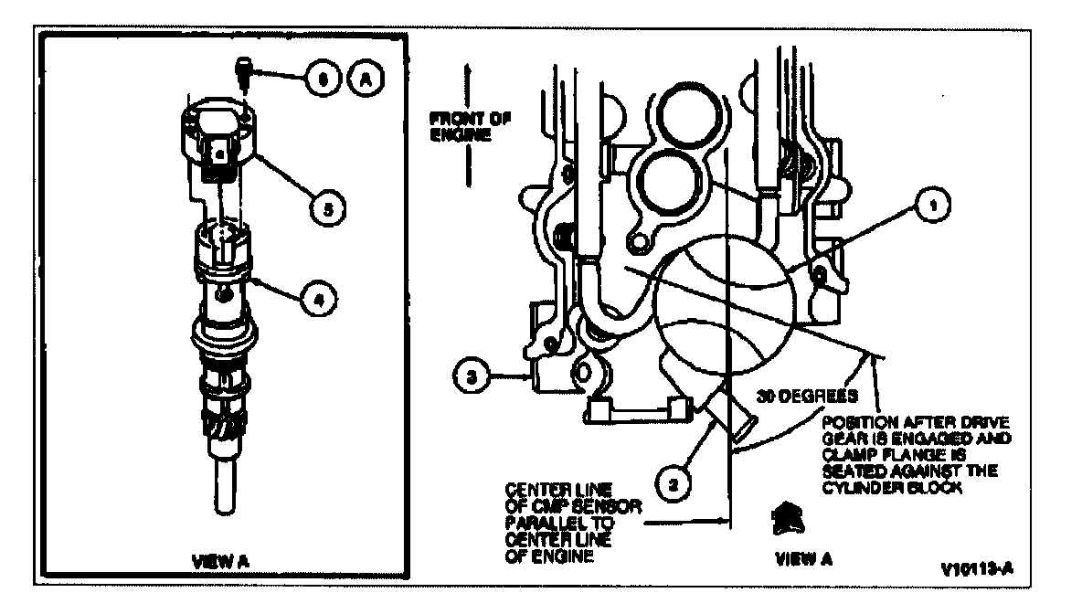 3. Install camshaft position sensor housing so drive gear engagement occurs when arrow on locator tool is pointed approximately as shown in the illustrations. This step will locate camshaft position sensor electrical connector in the pre-removal position.