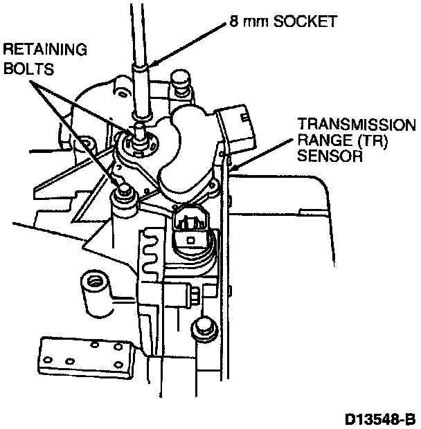 The Transmission Range Sensor is located at the left rear of the engine compartment, on top of the transmission housing.
