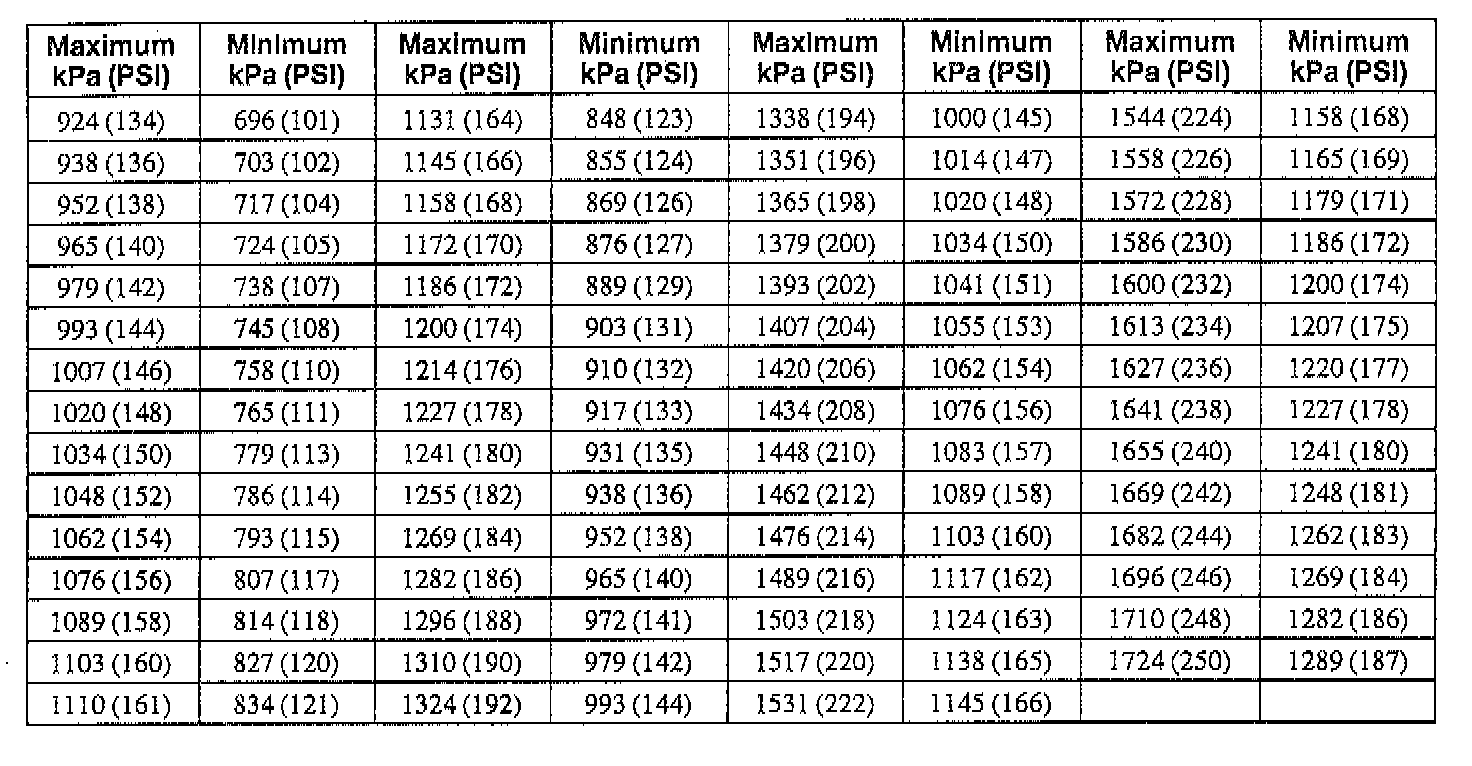 Examine and compare the readings for all of the cylinders. Pressure variation between the highest and lowest cylinders should be within 75 percent of one another. See provided chart. The chart shows maximum compression readings and their corresponding 75% minimums. Variations between cylinders will have a greater effect on engine performance than overall readings that are even but slightly below specifications.