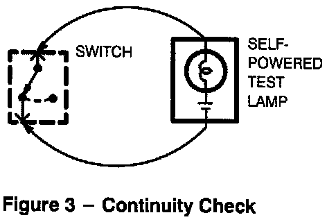 Connect one lead of Self-Powered Test Lamp or Ohmmeter to each end of circuit. Lamp will glow if circuit is closed. Switches and fuses can be checked in the same way.