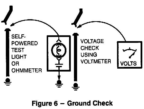 Turn on power to the circuit. Perform a Voltage Check between the suspected inoperative ground and the frame. Any indicated voltage means that the ground is inoperative.