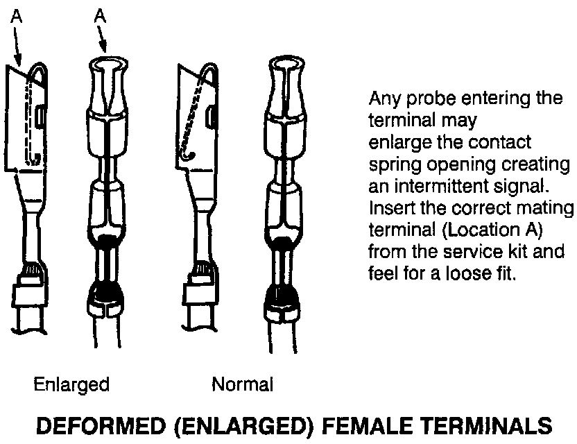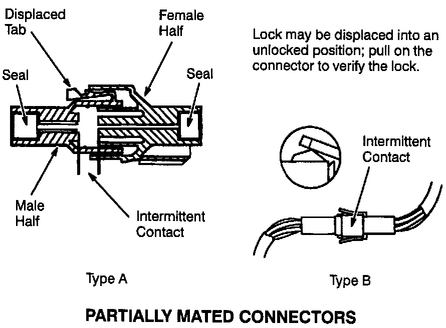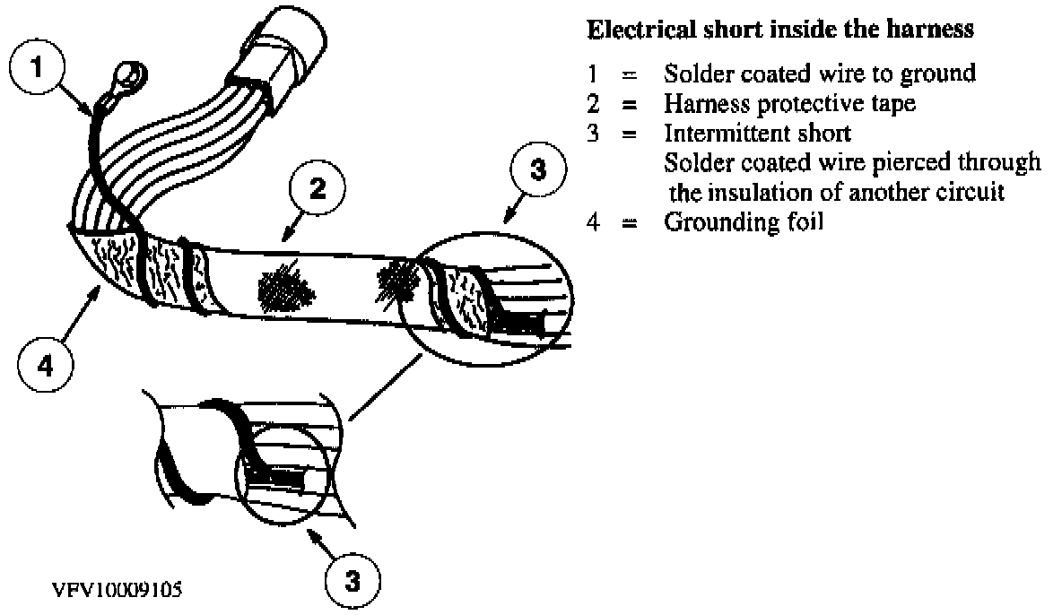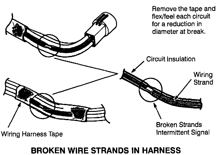 The following illustrations are known examples of wiring harness, splices and connectors that will create intermittent electrical concerns. The concerns are hidden and can only be discovered by a physical evaluation as shown in each illustration.