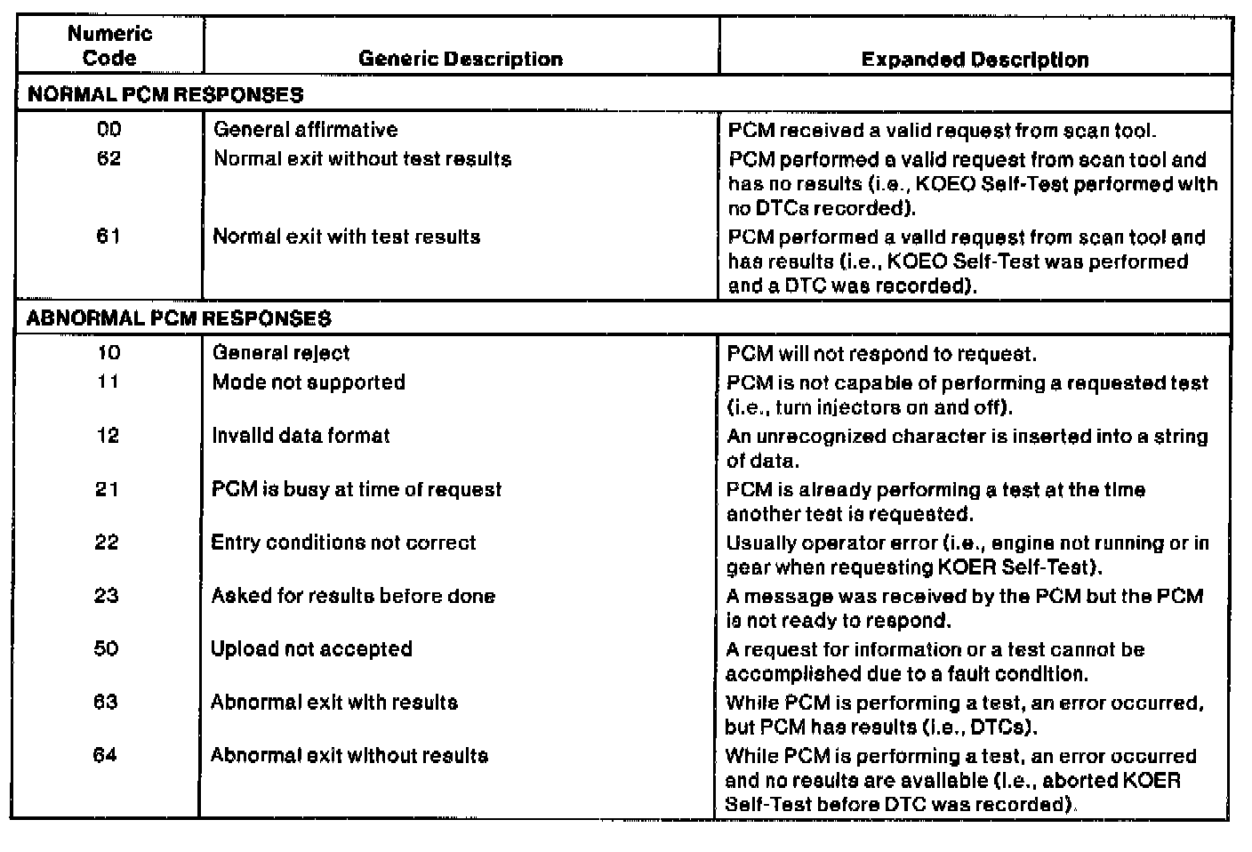 It is possible to receive a communication error from a scan tool when initiating a diagnostic test or accessing PIDs. The communication error can be caused by operator error, the vehicle wiring, connectors, the PCM, or other control modules connected to the DLC wiring. The PCM will respond to a scan tool whenever the tool requests a test. These are not diagnostic trouble codes. Listed are some of the numeric codes and generic descriptions that a scan tool may display when trying to perform some PCM operations. It is possible to get other numeric codes not listed. For a complete list of communication response codes, refer to Society of Automotive Engineers (SAE) document J2190 enhanced E/E Diagnostic Test Modes. Some are normal responses to valid requests. The others are communication error responses. If the tool displays any of the communication error responses, refer to Pinpoint Test Step QA1, after checking scan tool connections, cable/adapters, and entry of vehicle information. QA - Unable to Activate Self-Test/SCP Error/DTC Not Listed