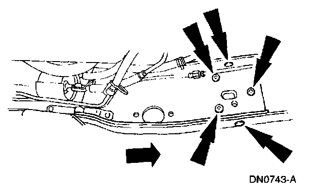 5 Remove the exhaust system components as necessary to access the front stub-to-reinforcement rivets.