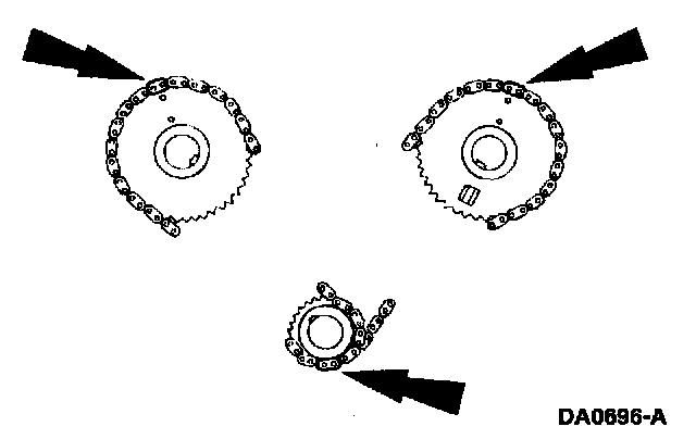- Position the timing chain on the camshaft sprocket. Make sure the two copper-colored links align with the camshaft sprocket timing mark.