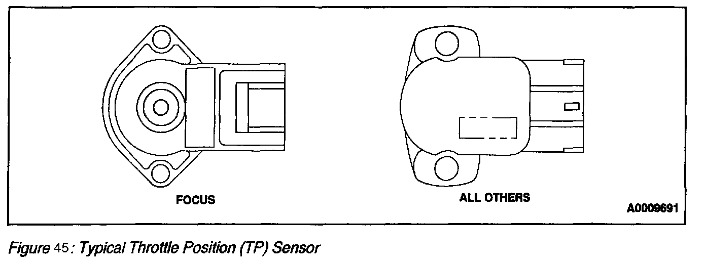 The Throttle Position (TP) sensor is a rotary potentiometer sensor that provides a signal to the PCM that is linearly proportional to the throttle plate/shaft position. The sensor housing has a three-blade electrical connector that may be gold plated. The gold plating increases corrosion resistance on terminals and increases connector durability. The TP sensor is mounted on the throttle body. As the TP sensor is rotated by the throttle shaft, four operating conditions are determined by the PCM from the TP. Those conditions are closed throttle (includes idle or deceleration), part throttle (includes cruise or moderate acceleration), wide open throttle (includes maximum acceleration or de-choke on crank), and throttle angle rate.