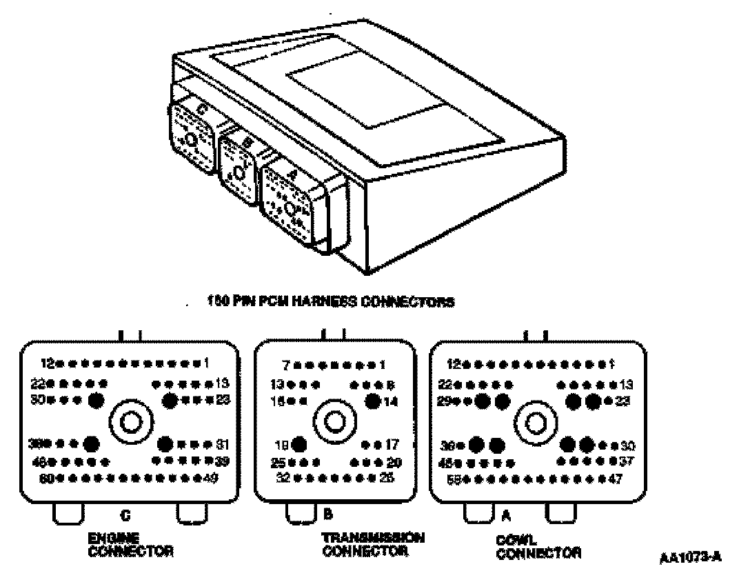 The center of the Electronic EC system is a microprocessor called the powertrain control module (PCM). LS6/LS8 applications will use a new 150-pin PCM (Figure 18). This PCM will also have three separate electrical harness connectors. All other applications will continue to use the standard 104-pin PCM (Figure 17). The PCM receives input from sensors and other electronic components (switches, relays). Based on information received and programmed into its memory, the PCM generates output signals to control various relays, solenoids and actuators.