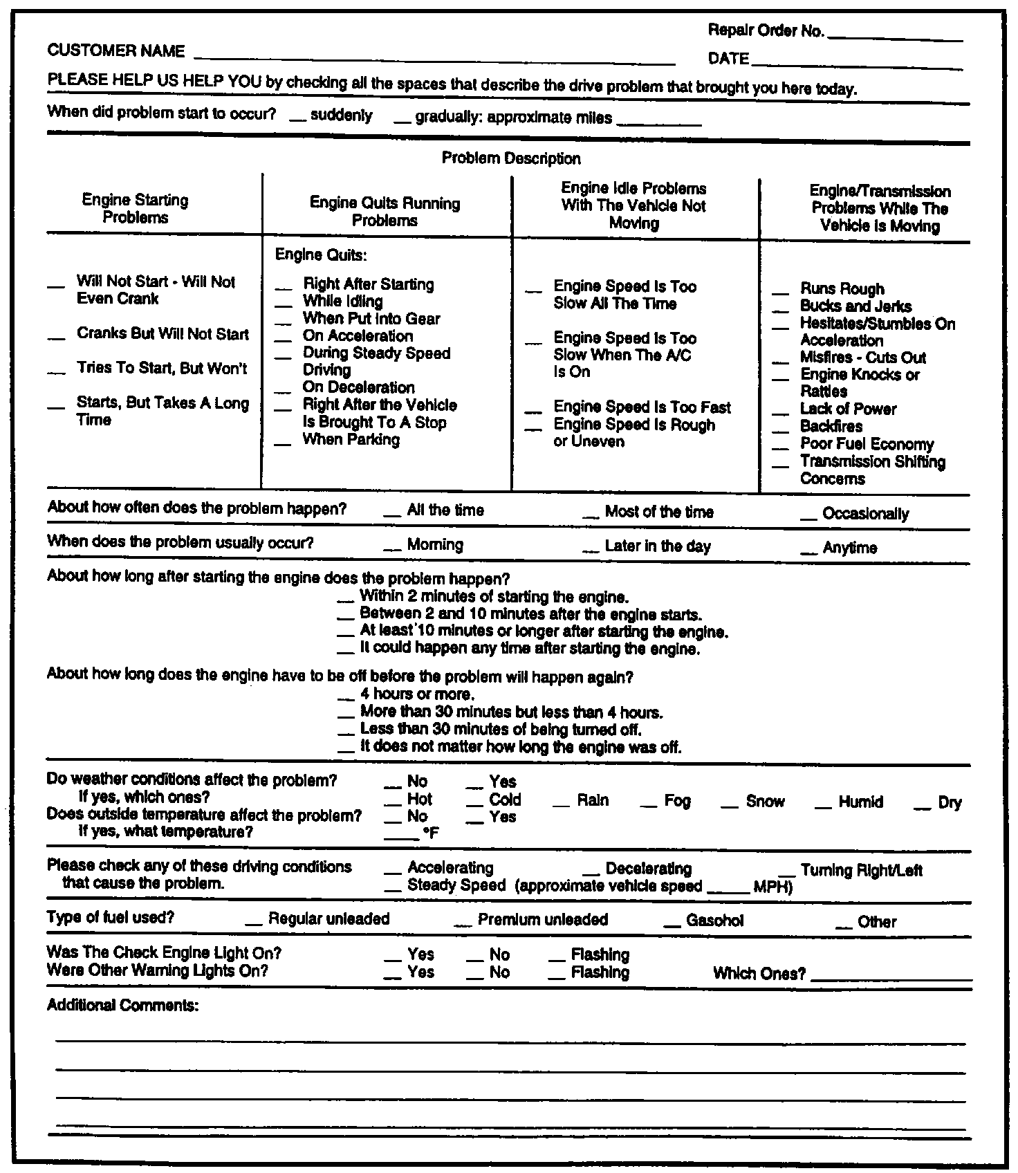 NOTE: If a symptom is determined to be intermittent, careful visual and physical underhood inspection of connectors, wiring harnesses, vacuum lines, components, etc. is required. The Customer Information Worksheet may contain more detailed symptom information. Before an in-depth diagnosis begins, start the engine and wiggle wires, tap on components, etc., while listening for an indication of a concern (such as rpm change or relay clicking).