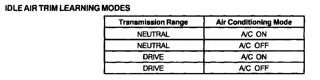 Once Keep Alive RAM has been reset, the engine must idle for 15 minutes (actual time varies between strategies) to learn new idle air trim values. Idle quality will improve as the strategy adapts. Adaptation occurs in four separate modes. The modes are shown in the table.