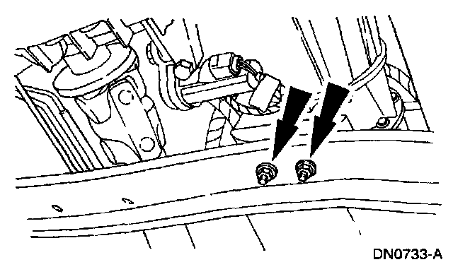 8. Remove the transmission support crossmember nuts and bolts (LH side).