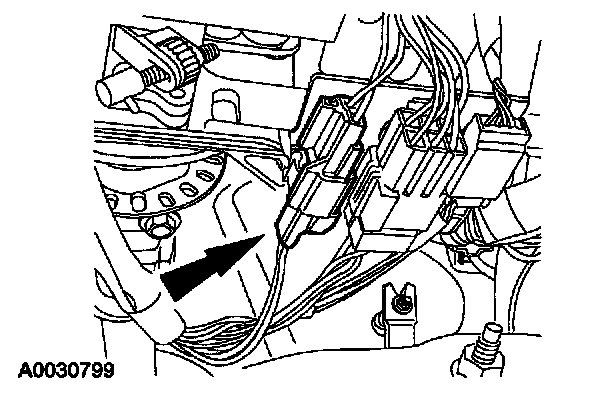 15. Push in to release the tab and disconnect the driver side safety belt retractor pretensioner electrical connector.