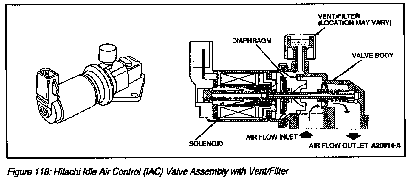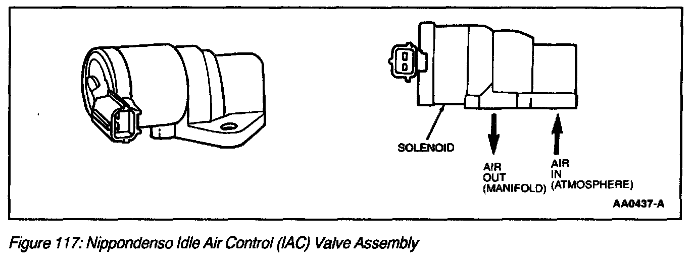 The idle air control (IAC) valve assembly (Figure 117) and (Figure 118) controls engine idle speed and provides a dash pot function. The IAC valve assembly meters intake air around the throttle plate through a bypass within the IAC valve assembly and throttle body. The PCM determines the desired idle speed or bypass air and signals the IAC valve assembly through a specified duty cycle. The IAC valve responds by positioning the IAC valve to control the amount of bypassed air. The PCM monitors engine rpm and increases or decreases the IAC duty cycle in order to achieve the desired rpm.