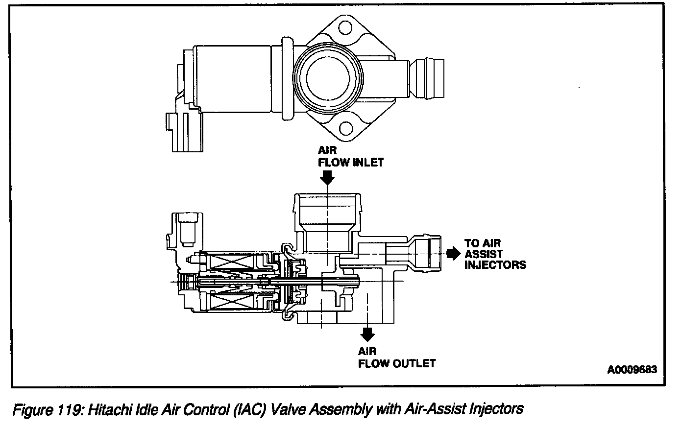 On applications with air-assisted injectors, the AC valve (Figure 119) also supplies a small amount of air into the path of the fuel injectors. The jet of air causes an increase in fuel atomization at low speed and light load conditions.
