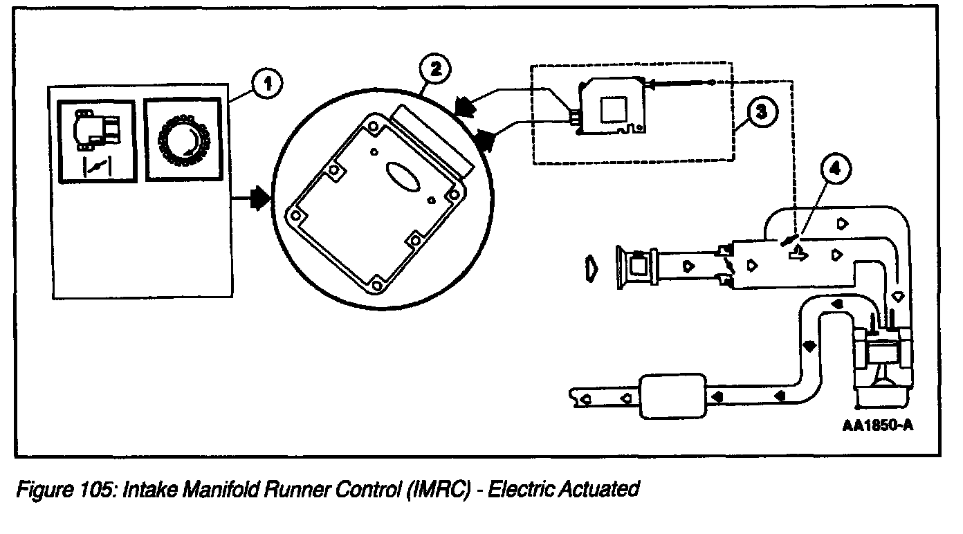 The Intake Manifold Runner Control (IMRC) Electric Actuated system (Figure 105) consists of a remote mounted motorized actuator with an attaching cable for each housing on each bank. Some applications will use one cable for both banks. The cable or linkage attaches to the housing butterfly plate levers. The 2.0L (2V) Focus/Escort IMRC uses a motorized actuator mounted directly to a single housing without the use of a cable. Each IMRC housing is an aluminum casting with two intake air passages for each cylinder. One passage is always open and the other is opened and closed with a butterfly valve plate. The housing uses a return spring to hold the butterfly valve plates closed. The motorized actuator houses an internal switch or switches, depending on the application, to provide feedback to the PCM indicating cable and butterfly valve plate position.