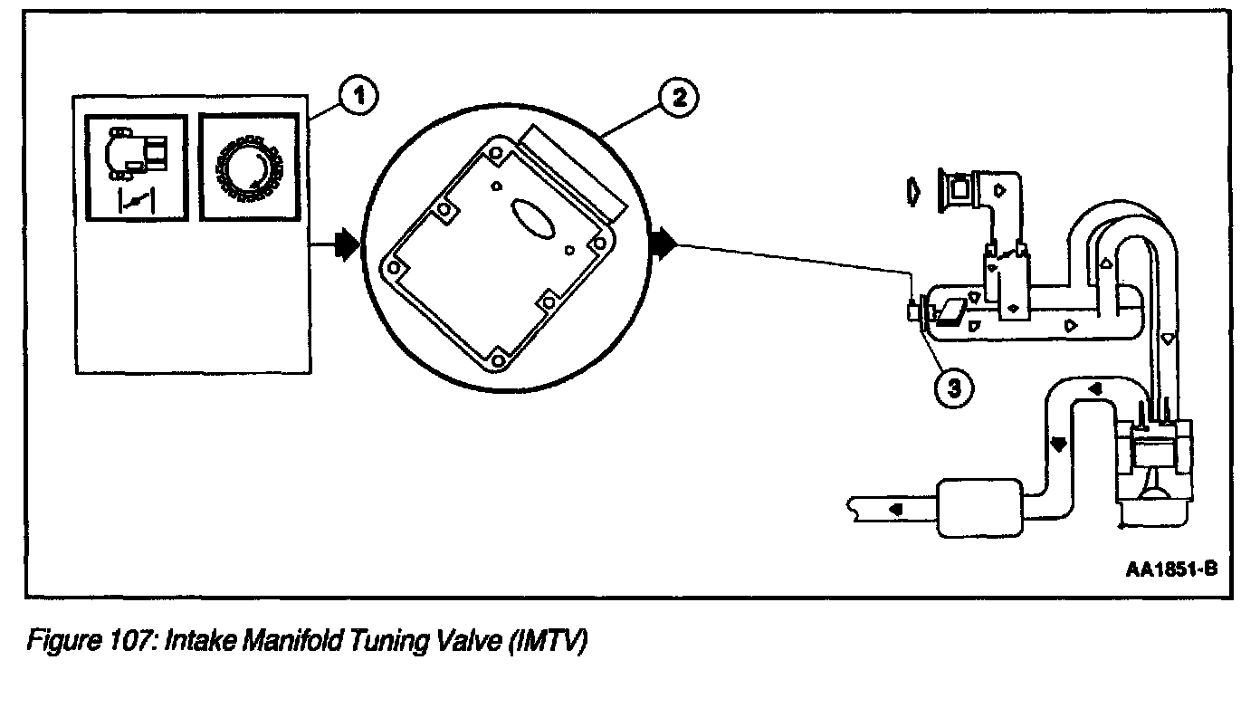 The intake manifold tuning valve (IMTV) (Figure 107) is a motorized actuated unit mounted directly to the intake manifold. The IMTV actuator controls a shutter device attached to the actuator shaft. There is no monitor input to the PCM with this system to indicate shutter position.