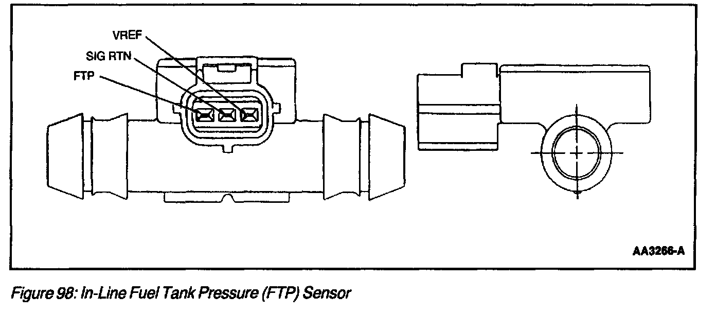 The Fuel Tank Pressure (FTP) sensor (Figure 97) or inline fuel tank pressure (FTP) sensor (Figure 98) is used to measure the fuel tank pressure during the EVAP monitor test on vehicles equipped with the Running Loss-type system. Also, it is used to control excessive fuel tank pressure by forcing the system to purge.