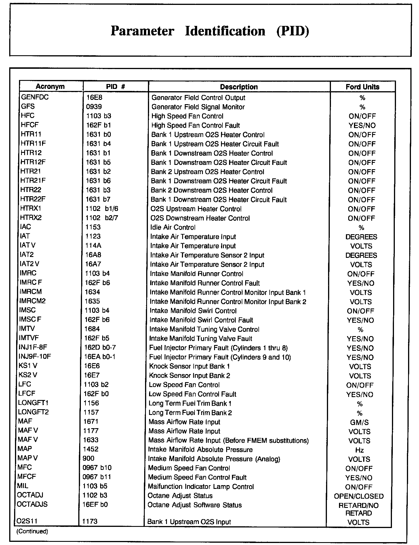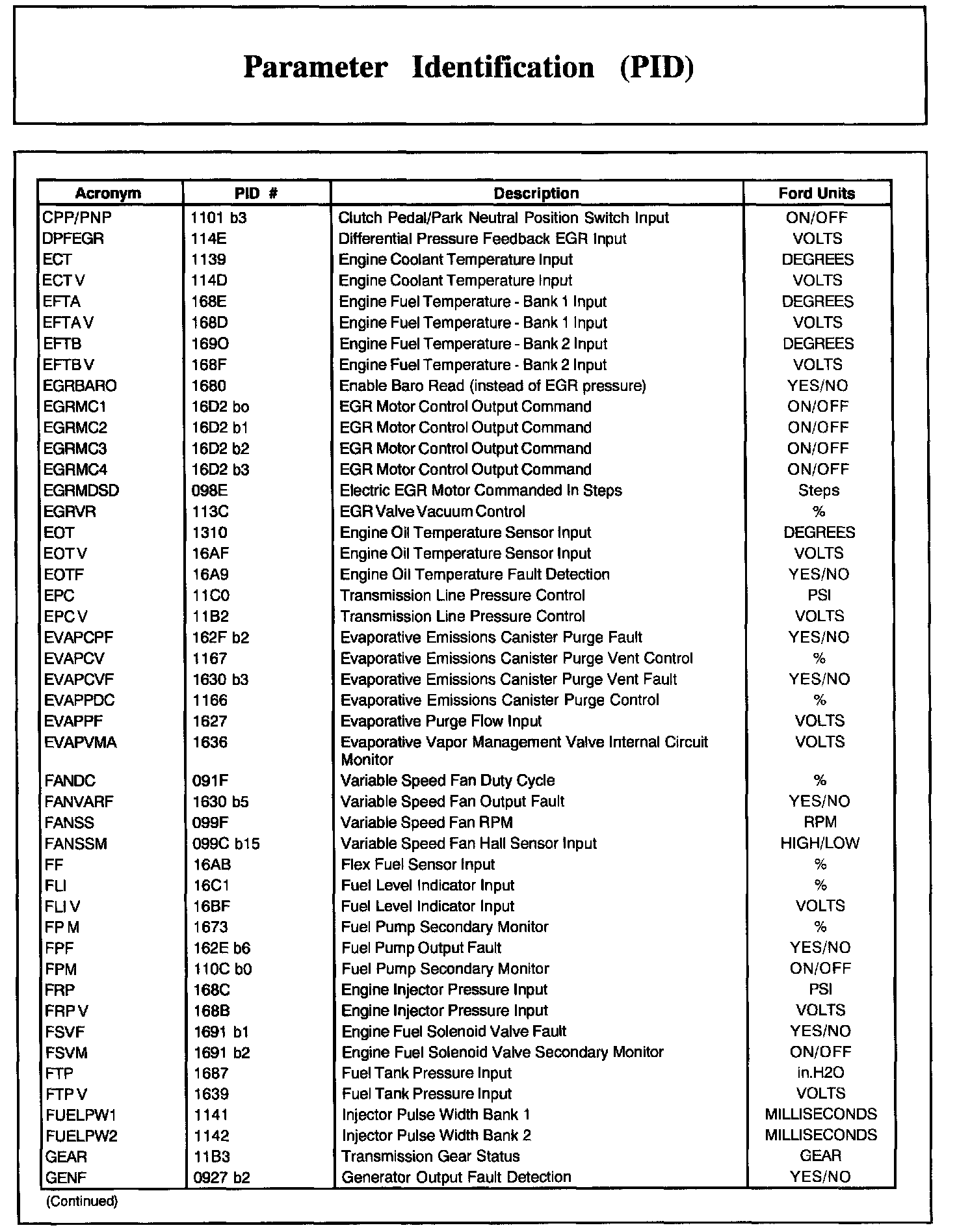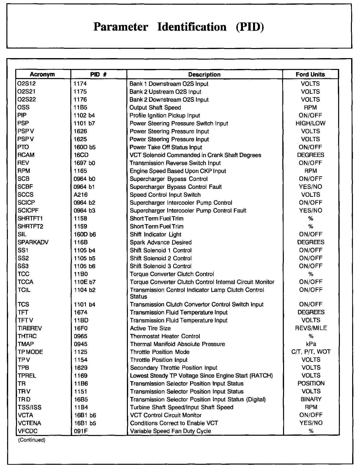 Home >> Ford >> 2002 >> Excursion 2WD V10-6.8L >> Repair and Diagnosis >> Powertrain Management >> Computers and Control Systems >> Testing and Inspection >> Scan Tool Testing and Procedures >> Normal Scan Data Values - Includes PIDs >> Parameter Identification (PID)