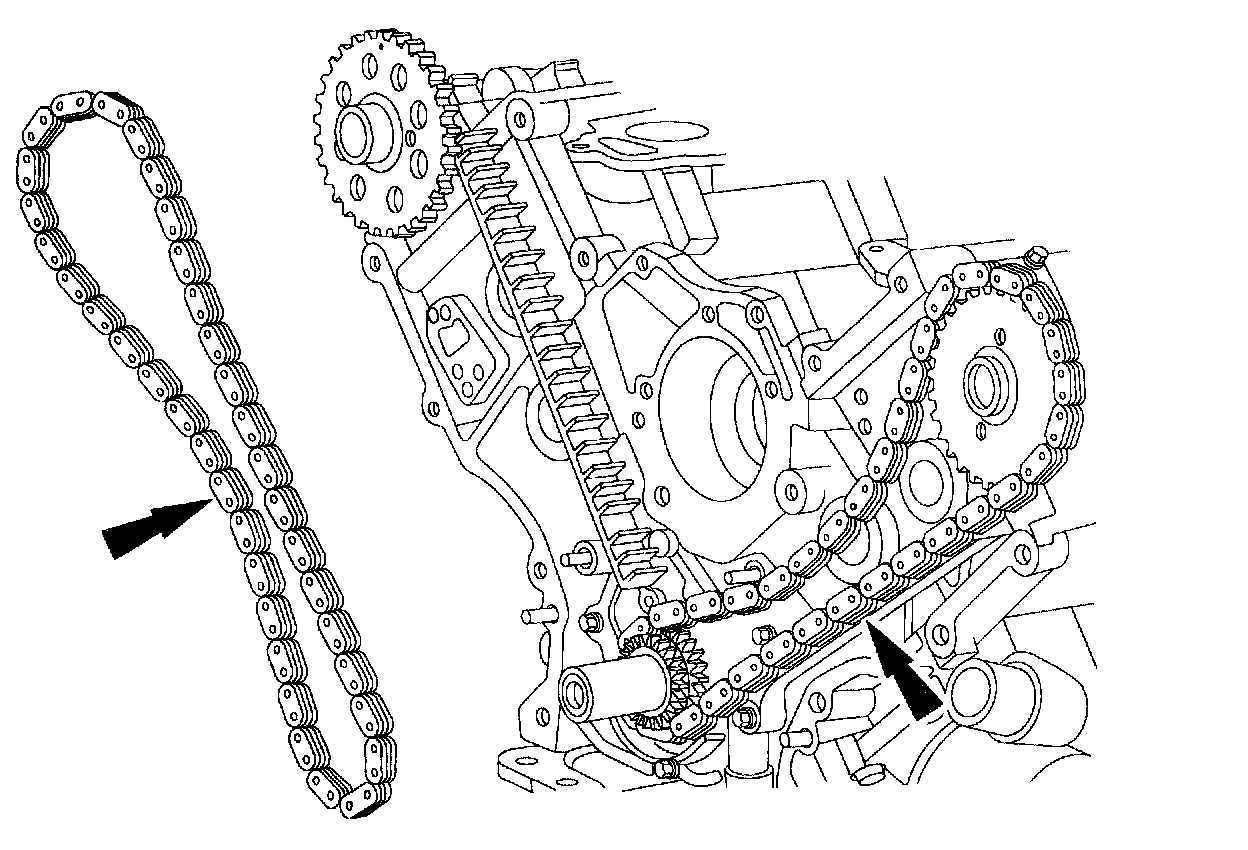 - Install the RH (outer) timing chain on the crankshaft sprocket, aligning the copper link with the dot on the crankshaft sprocket.