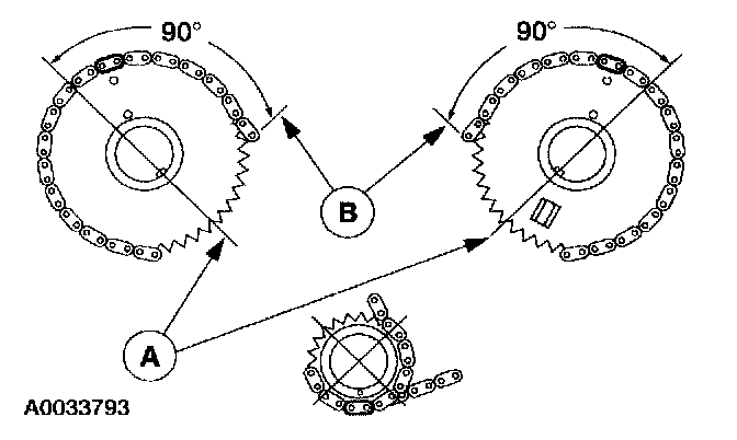 Make sure that the (A) camshaft sprocket keyway is 90 degrees from the (B) valve cover mounting surface.