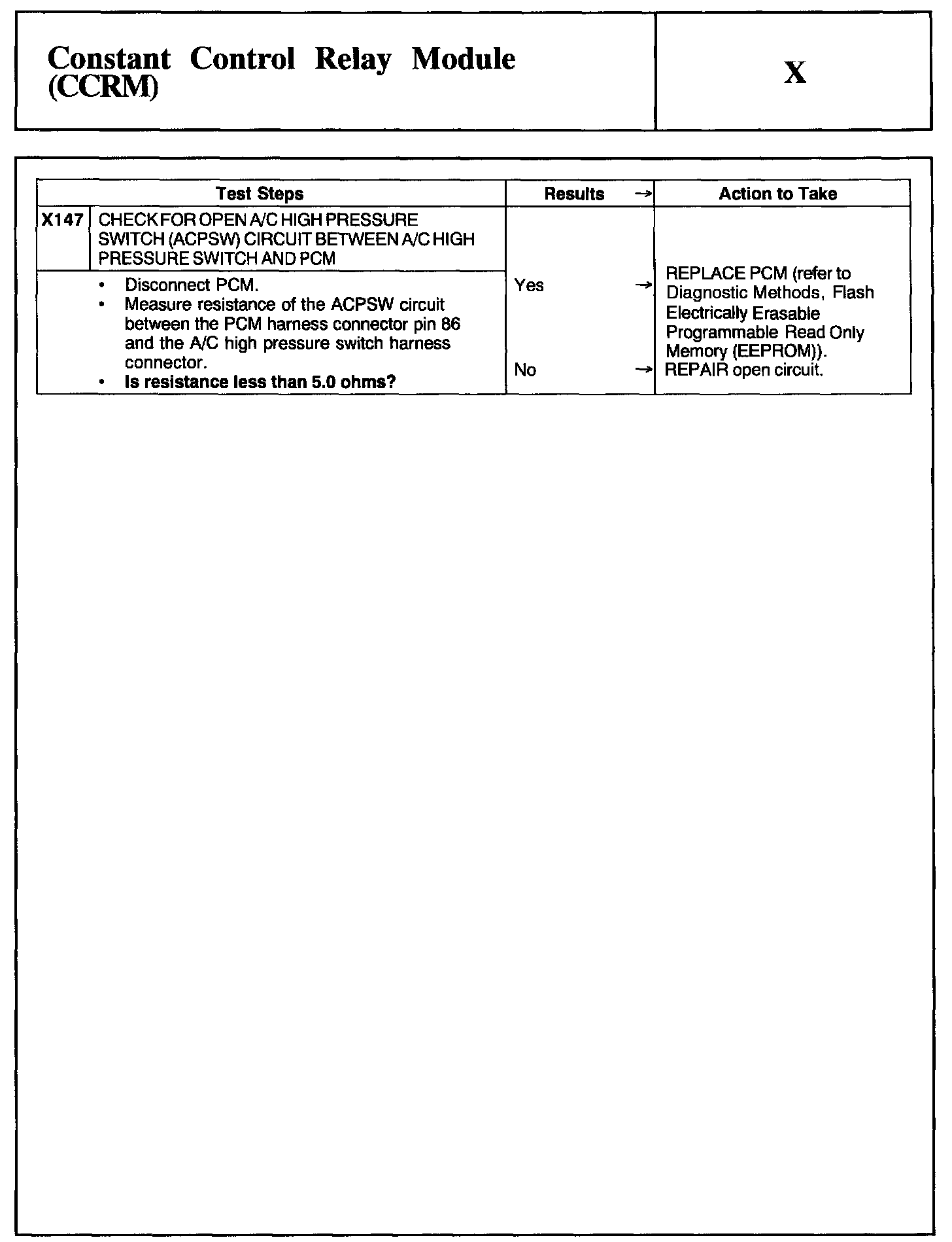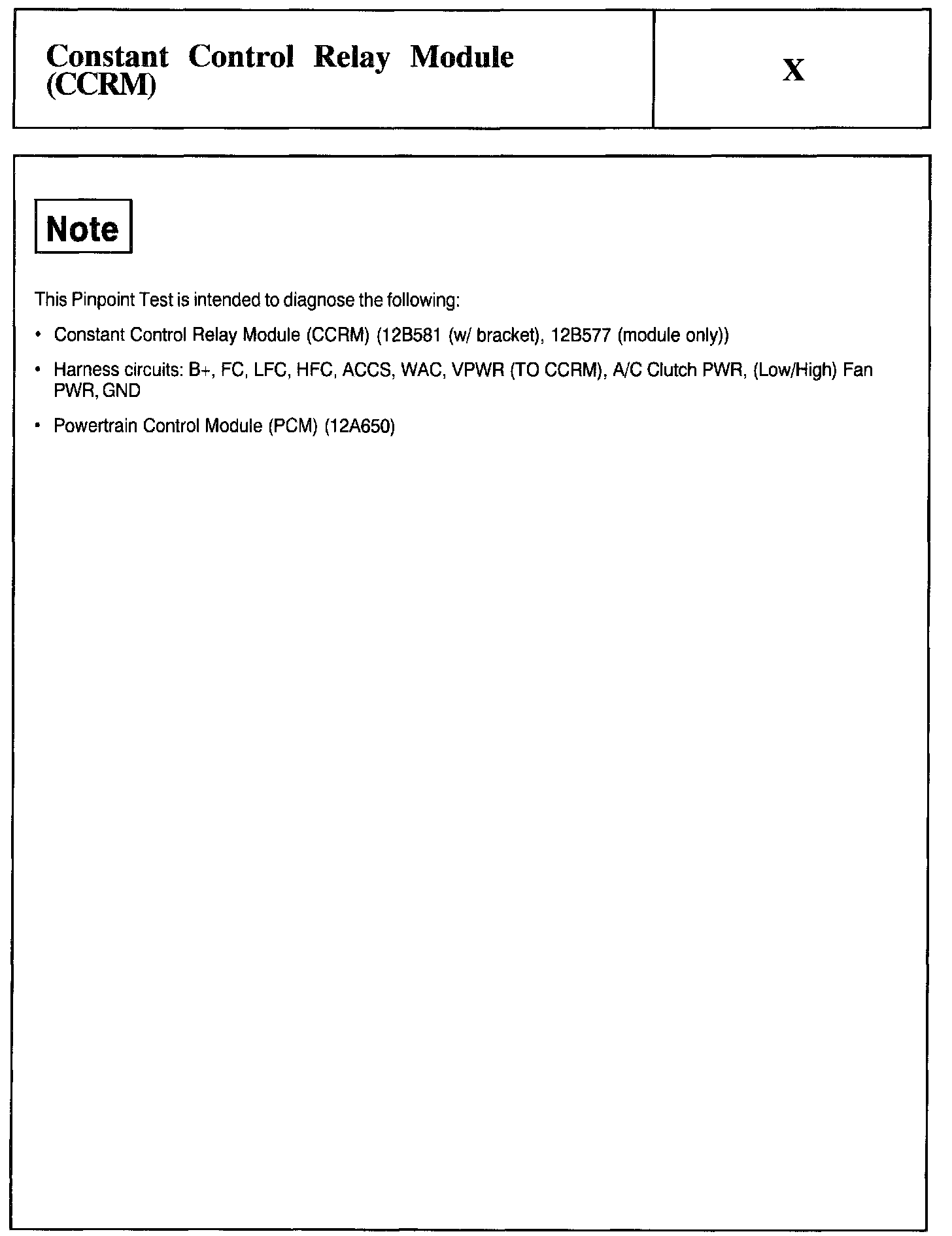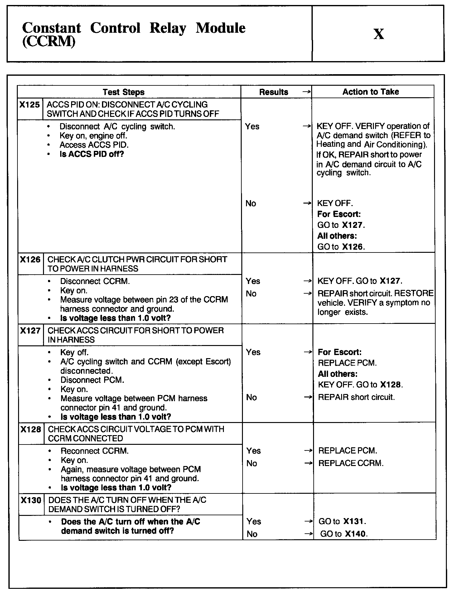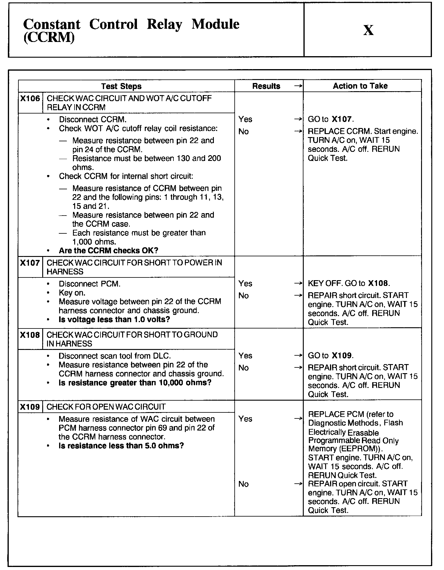 Home >> Ford >> 2002 >> Taurus V6-3.0L VIN U >> Repair and Diagnosis >> Powertrain Management >> Computers and Control Systems >> Testing and Inspection >> Pinpoint Tests >> Test X: Constant Control Relay Module (CCRM)