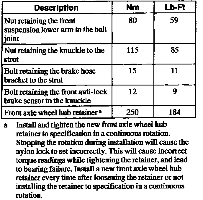 Torque Specificationsa Install and tighten the new front axle wheel hub retainer to specification in a continuous rotation. Stopping the rotation during installation will cause the nylon lock to set incorrectly. This will cause incorrect torque readings while tightening the retainer, and lead to bearing failure. Install a new front axle wheel hub retainer every time after loosening the retainer or not installing the retainer to specification in a continuous rotation.