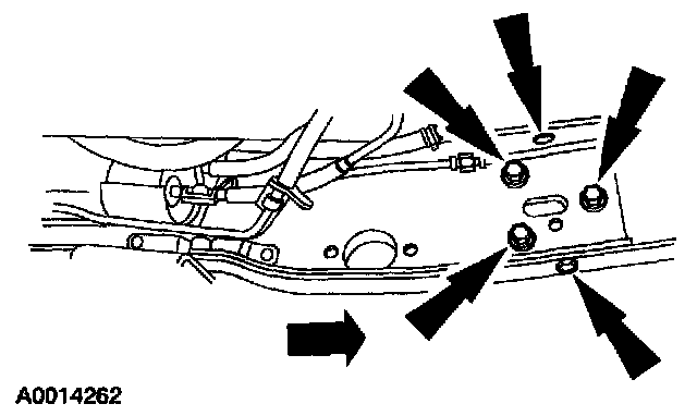 5 Remove the exhaust system components as necessary to access the front stub-to-reinforcement rivets.