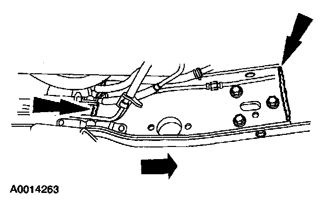 Remove and discard the rivets used to secure the side rail reinforcements to the front stub frame and rear side rail. Separate the weld joints.