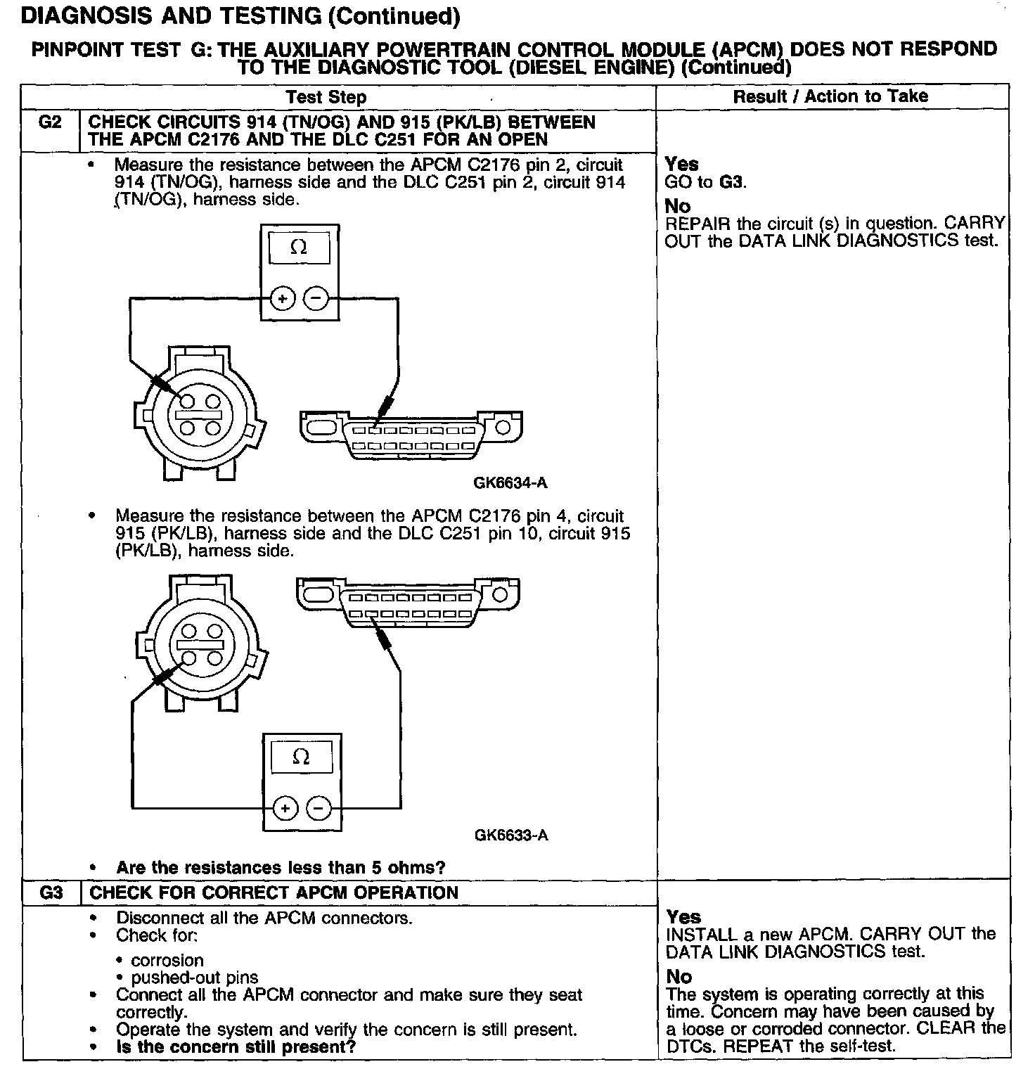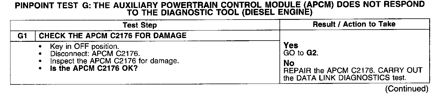 PINPOINT TEST G: THE AUXILIARY POWERTRAIN CONTROL MODULE (APCM) DOES NOT RESPOND TO THE DIAGNOSTIC TOOL (DIESEL ENGINE)